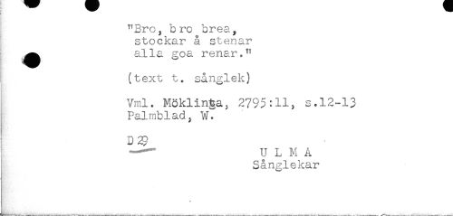 //// "Bro, bro brea, //// stockar å stenar //// ^^ alla goa renar." //// ! (text t. sånglek) //// - //// Vml. Möklinta, 2795:11, s.12-13 //// Palmblad, W. //// I D^ //// ---ULMA //// Sånglekar //// * ////