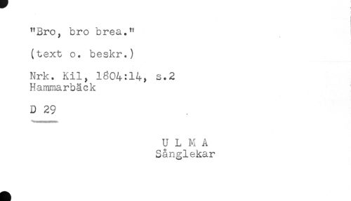 //// "Bro, bro brea." i //// (text o. beskr.) //// Nrk. Kil, 1604:14, s.2 //// Hammarbäck //// D 29 //// ULMA //// Sånglekar ////