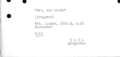 //// "Bro, bro breda" //// ^ (fragme nt) //// Nrk. A sker, 1914:3, s.42 //// Kinnander //// D 2 9 //// U L M A //// } Sånglekar ////