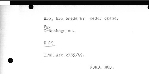 //// Bro, bro breda av medd. okänd. //// Vg. //// Grönahögs sn. //// D 29 //// IFGH Åcc 2765/49. //// NORD. MUS. ////