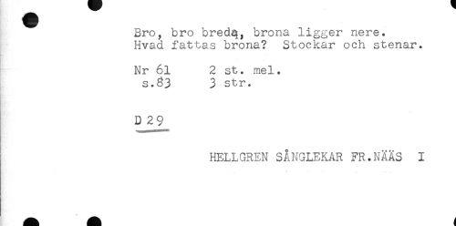 //// Bro, bro breda, brona ligger nere. //// Hvad fattas brona? Stockar och stenar. //// Nr 61 2 st. mel. //// s.^3 3 str. //// D 2 9 //// HELLGREN SÅNGLEKAR FR.NÄÄS I ////