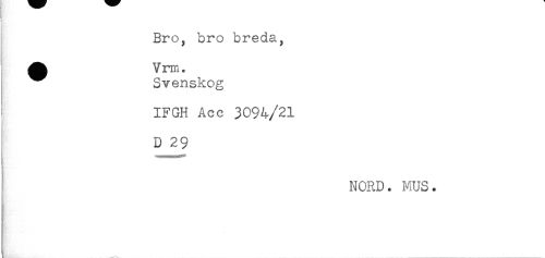 //// Bro, bro breda, //// ^ Svenskog //// ! IFGH Acc 3094/21 //// D 29 //// NORD. MUS. ////