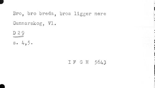 //// Bro, bro breda, broa ligger nere ^ //// 5 //// Gunnarskog, VI. //// D 29 ^ //// i //// s+ 4,5. g //// f //// = //// i //// — //// H //// I F G H 5643 //// t //// * //// c //// ^ //// r* ////