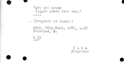 //// "Bro bro brede //// ligger snett över ede." //// * + + + //// , (Fragment av beskr.) //// Sdml. Råby-Rönö, 4881, s.98 //// Palmblad, W. //// D_29 ////
