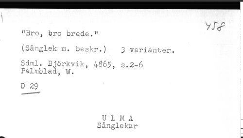 //// "Bro, bro brede." //// (Sånglek m. beskr.) 3 varianter. //// - ! //// * //// Sdml. Björkvik, 4665, s.2-6 //// Palmblad, W. //// D 29 //// ! ////