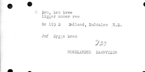 //// M Bro, bro bree //// ligger unner ree //// Nr 193 B Snåland, Smådalen E.S. //// Jmf Bygga bron //// NORDLANDER BARNVISOR ////