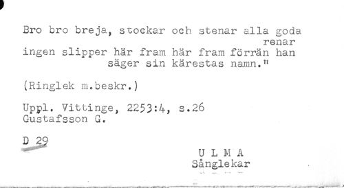 //// Bro bro breja, stockar och stenar alla goda //// renar //// ingen slipper här fram här fram förrän han //// säger sin kärestas namn." //// (Ringlek m+beskr.) //// Uppl. Vittinge, 2253:4, s.26 //// Gustafsson G. //// D 29 //// ^ * //// ULMA //// Sånglekar //// h)' ;. .... ////