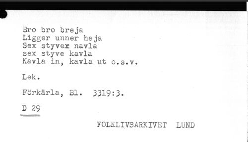 //// Bro bro breja //// Ligger unner heja //// Sex styvex navla //// sex styve kavla //// Kavla in, kavla ut o.s.v. //// t //// Lek. //// i //// Förkärla, 31. 3319:3. //// i //// ! //// D 29 ////