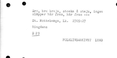 //// Bro, bro breja, stocka å steja, ingen //// släpper här fram, här fram --- //// St. Mottebeiyga, Lk. 2709:27 //// Ringdans //// D 29 //// FOLKLIVSARKIVET LUND ////