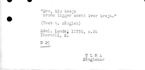 //// "Bro, bio breja //// ^ brona ligger snett över breja." //// (Text t. sånglek) //// Sdml. Lunda; 11750, s.24 //// Thomell^, S. //// D 29 ////