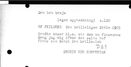 //// : (egen uppteckning) s.120 //// HF FEILBE^G Bro brilleligen Sthlm 1$05 //// Brodin anser bl.a. att den nu försvunna //// Drog jag mig öfver det salta haf //// finns som dansk Bro brille-lek ////