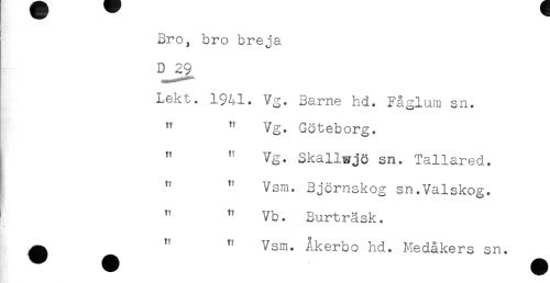 //// Lekt. 1941. Vg. Bame hd. Fåglum sn. //// " " Vg. Göteborg. //// " " Vg. Skallwjö sn. Tallared. //// " " Vsm. Björnskog sn.Valskog. //// ' " " Vb. Burträsk. //// ^ ^ " " Vsm. Åkerbo hd. Hedåkers sn. ////