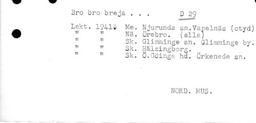 //// Rro oro oreja ... D 29 //// Lekt. 19419 Me. Njurunda sn.Vapelnäs (otyd) //// # " " Nä. Örebro. (alla) //// " " Sk. Glimminge sn. Glimminge by. //// " " Sk. Hälsingborg. //// " " Sk. Ö.Göinge hd. Crkenede sn. //// r- //// NORD. MUS. //// ____ ____ ____ .-"""'--t_ ////