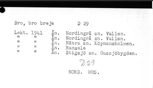 //// Bro, bro breje D 29 //// Lekt. 1941 Ån. Nordingrå sn. Vallen. //// " " An. Nordingrå sn. Vallen. //// " " An. Nätra sn. Köpmansholmen. //// " " An. Ramsele //// " " Ån. Stigsjö sn. Gussjöbygden. ////