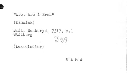 //// t //// Bro, bro i Brea" //// (Danslek) //// r //// Smål. Benkeryd, 731?, s.l ! //// Stålberg ! //// s, 9 i //// (Lekmelodier) ^ //// U L M A //// r //// < //// E //// E ////
