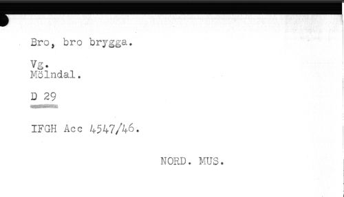 //// ! //// . Bro, bro brygga. //// Vg. //// Mölndal. //// < //// D 29 //// * //// IFGH Acc 4547/46. //// NORD. MUS. ////