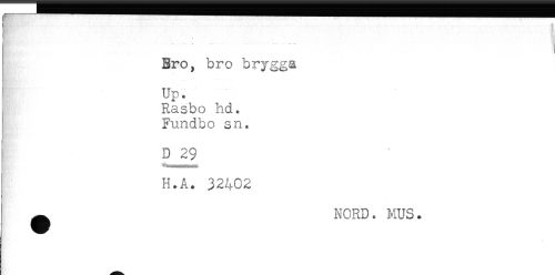 //// j Bro, bro brygga //// ' Up. //// Rasbo hd. //// Fundbo sn. //// D 29 //// H.A. 32402 //// ^ NORD. MUS. ////
