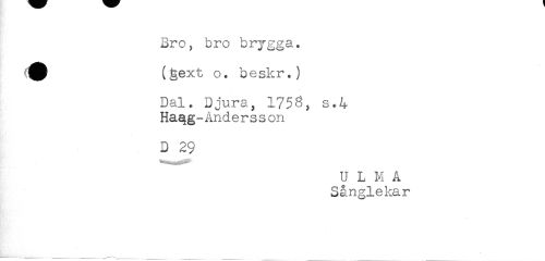 //// Bro, bro brygga. //// ^ (§ext o. beskr.) //// Dal. Djura, 1756, s.4 //// Haag-Änderss on //// D 29 //// U L M A //// Sånglekar ////