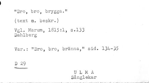 //// "Bro, bro, brygga." //// (text m. beskr.) //// Vgl. Marum, 1315:1, s,133 //// Dahlberg //// Var.: "Bro, bro, bränna," sid. 134-35 //// D 29 //// U L M A //// Sånglekar ////