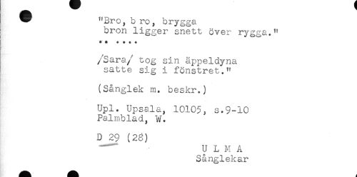 //// " "Bro, b ro, brygga //// bron ligger snett över rygga." //// * * * * A * //// * //// /Sara/ tog sin äppeldyna //// satte sig i fönstret." //// (Sånglek m. beskr.) //// . //// Upl. Upsala, 10105, s.9-10 //// Palmblad, W. //// D 29 (2g) //// ULMA //// Sånglekar ////