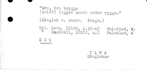 //// "Bro, bro brygga //// (soln?) ligger snett under rygga." //// ^ (Sånglek m. beskr. Fragm.) //// Upl. Lena, 10100, s.39-40 Palmblad, W. //// " Rasbokil, 10102, s.7 Palmblad, W //// D 2 9 //// ULMA //// Sånglekar ////