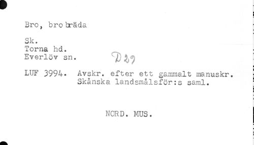 //// ! //// Bro, bro bräda //// Sk. //// Torna hd. ^ //// Everlöv sn. C //// a //// LUF 3994. Avskr. efter ett gammalt manuskr. j //// Skånska landsmålsför:s saml. ^ //// a //// — //// NORD. MUS. //// H //// t- ////