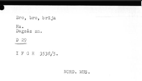 //// Bro, bro, bräja //// Ha. //// Dagsås sn. //// D 29 //// I F G H 3533/5. //// NCRD. MUS. ////