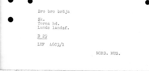 //// Bro bro bräja //// Torna hd. //// Lunds landsf. //// D 29 //// LUF 4603/1 //// NORD. MUS. //// * //// * ////