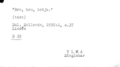 //// "Bro, bro, bräja.'' //// (text) //// Dal. Sollerön, 2590:2, s.37 //// Lindén //// D 29 //// U L M Å //// Sånglekar ////