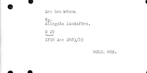 //// Bro bro bränna //// Vg. //// Alingsås landsförs. //// D 29 //// IFGH Acc 2633/19 //// NCRD. MUS. //// E //// - //// * ////