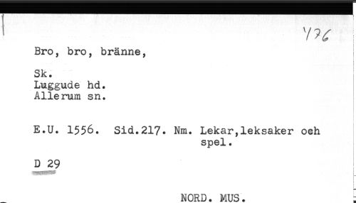 //// Bro, bro, bränne, i //// ! //// < //// Sk. //// Lnggude hd. //// Allerum sn. //// E.U. 1556. Sid.217. Nm. Lekar,leksaker och //// spel. //// D 29 //// t ////
