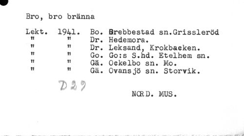 //// Bro, bro bränna //// Lekt. 1941. Bo. Brebbestad sn.Grissleröd //// " " Dr. Hedemora. //// " " Dr. Leksand, Krokbacken. //// " " Go. Go:s S.hd. Etelhem sn. //// " " Gä. Ockelbo sn. Mo. //// " " Gä. Ovansjö sn. Storvik. //// NCRD. MUS. ////