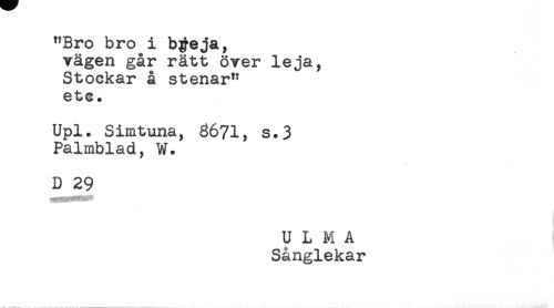 //// "Bro bro i bpeja, //// vägen går rätt över leja, //// Stockar å stenar" //// ete. //// Upl. Simtuna, 3671, s.3 //// Palmblad, W. //// D 29 ////