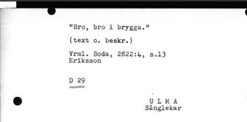 //// B '* //// < f //// "Bro, bro i brygga." //// (text o. beskr.) //// Vrml. Boda, 2822:4, s.13 //// Eriksson //// D 29 //// r //// t * //// t # //// # ULMA //// Sånglekar ////