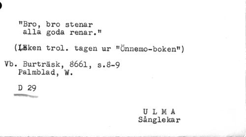 //// "Bro, bro stenar //// alla goda renar." //// (^Bken trol. tagen ur "Önnemo-boken") //// Vb. Burträsk, 8661, s.8-9 //// Palmblad, W. //// * //// D 29 ////