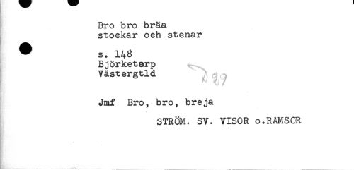 //// Bro bro bräa //// stoekar och stenar //// ^ s. 143 //// Björketarp //// Västergtld ^ //// B'' . . //// Jmf Bro, bro, breja //// STRÖM. SV. VISOR o.RAMSOR ////