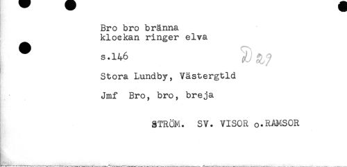 //// Bro bro bränna //// klockan ringer elva //// ^^^^^^^^^^^ i—[fYttii //// s.146 ^ ^ ? //// Stora Lundby, Västergtld //// Jmf Bro, bro, breja //// 3TRÖM. SV. VISOR o.RAMSOR //// //// /JU'*'. '' ////