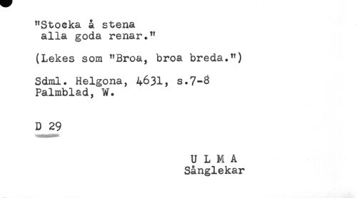 //// "Stoeka å stena //// alla goda renar." //// (Lekes som "Broa, broa breda.") //// Sdml. Helgona, 4631, //// Palmblad, W. //// D 29 ////