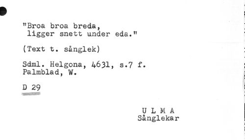 //// "Broa broa breda, //// ligger snett under eda." f //// (Text t. sånglek) //// Sdml. Helgona, 4631, s.7 f. ! //// Palmblad, W. = //// D 29 //// ULMA //// Sånglekar //// - //// - //// } //// t ////