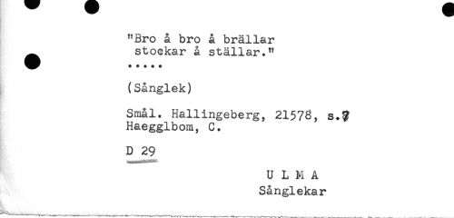 //// "Bro å bro å brällar //// ^ stockar å ställar." //// (Sånglek) //// Smål. Hallingeberg, 21573, s.% //// Haegglbom, C. //// D 29 //// U L M A //// Sånglekar //// \ ' . . //// \ //// ---___^___,___ ////