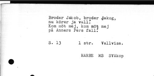 //// — - - - - -- .... - , . //// Broder Jakob, broder Jakog, //// nu körer ja vallf //// Kom möt mej, kom möt mej //// på Anners Pers fallf //// * //// S. 13 1 str. Vallvisa. //// HARBE HS SVAkop ////