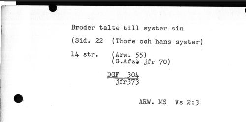 //// Broder talte till syster sin //// (Sid. 22 (Thore och hans syster) //// v //// 14 str. (Arw. 55) //// (G.Afz$ jfr 70) //// ^ ARW. MS Vs 2:3 ////