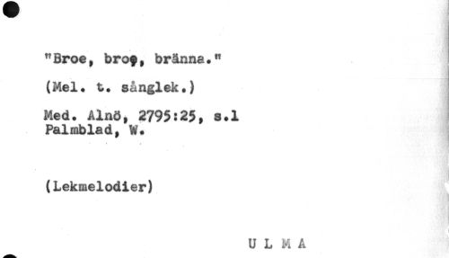 //// "Broe, bröt, bränna *" //// '* ' . ..... - MMåMH)] //// (Mel. t. sånglek.) //// Med. Ainö, 2795:2$, s.l //// Palmblad, W. //// * //// (Lekmelodier) //// i //// ULMA ////