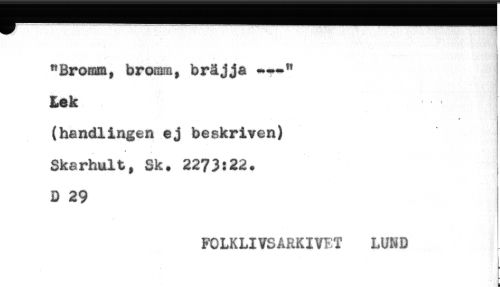 //// "Bromm, bromm, bråjja //// ^ek //// (handlingen ej beskriven) //// Skarhult, Sk. 2273:22. //// D 29 //// FOLKLIVSARKIVET LUND //// s ////
