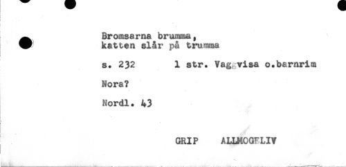 //// I //// ! //// ! //// ^ Bromsarna brumma, //// W katten slår på tru^na //// t //// s. 232 1 str. Vag.visa o.bernrim //// Nora? //// Nordl. 43 //// . //// ... //// GRIP ALLMOGFLIV ////