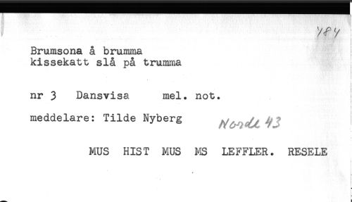 //// i //// Brumsona å brumma I //// kissekatt slå på trumma //// i //// i //// i //// nr 3 Dansvisa mel. not. ! //// t //// i //// ! //// meddelare: Tilde Nyberg ^ //// MUS HIST MUS MS LEFFLER. RESELE ////