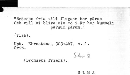 //// ---—----.----—---^--- - //// "Bromsen fria till flugans hov pärum ! //// Och vill ni bliva min mö i år hej kummeli //// pärsum pärum." : //// (Visa). //// - //// t //// Up3). Ehrentuna, 303:467, s. 1. //// Grip. //// (Bromsens frieri). //// ULMA ////