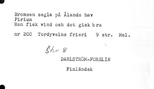 //// Bromsen segla på Ålands hav //// Pirium //// Han fick vind och det gick bra //// nr 200 Tordyvelns frieri 9 str. Mel. //// DAHLSTRÖM-FORSLIN //// Finländsk ////