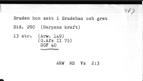 //// i //// Bruden hon satt i Brudehus och gret //// Sid. 290 (Harpans kraft) //// 13 str. (Arw. 149) //// (G.Afz II 75) //// DGF 40 //// ARW MS Vs 2:3 //// = ////