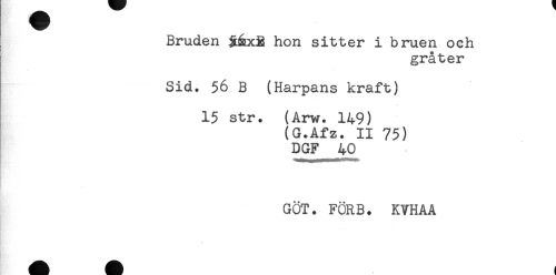 //// Bruden hon sitter i bruen och //// gråter //// Sid. 56 B (Harpans kraft) //// 15 str. (Arw. 149) //// (G.Afz. II 75) //// DGF 40 //// GÖT. FÖRB. KVHAA ////
